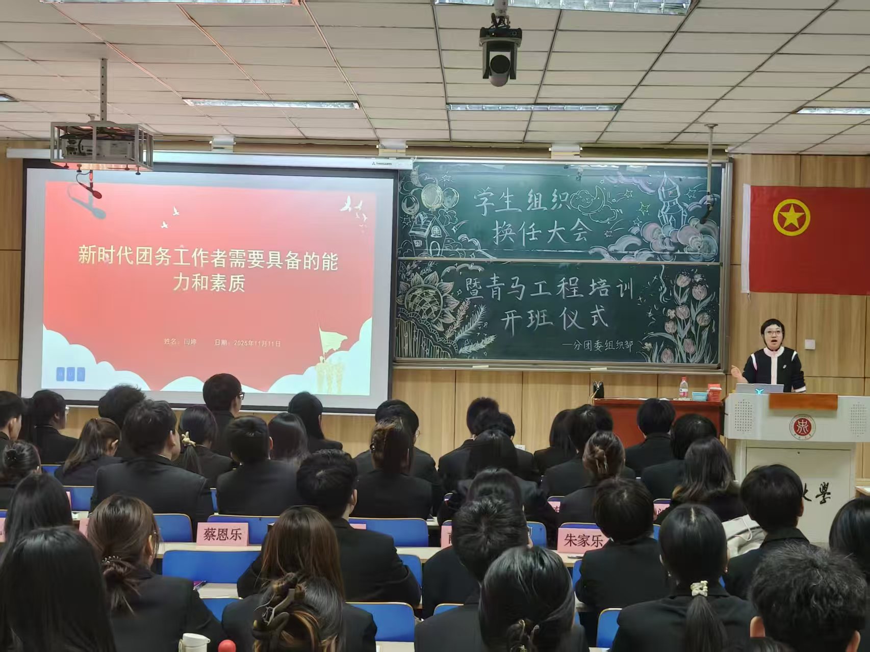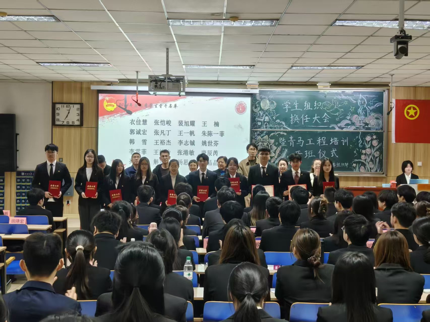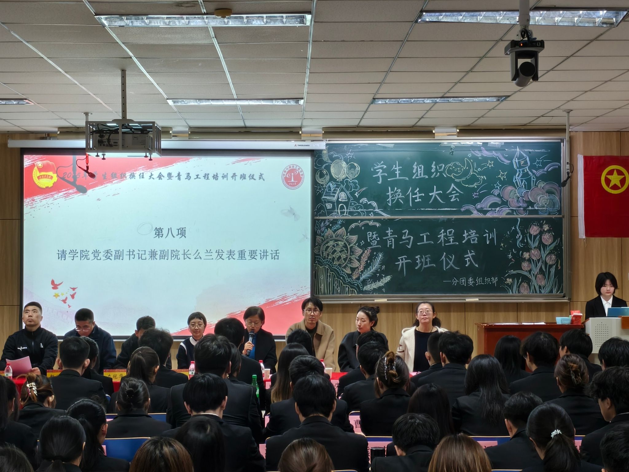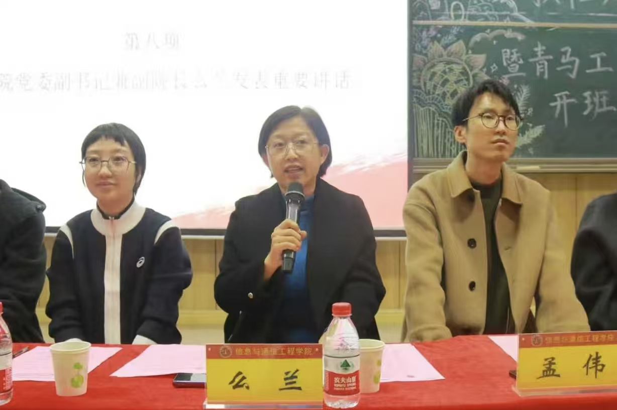 2025年11月11日晚19时,信息与通信工程学院2025年度学生组织换任大会暨青马工程培训开班仪式在09102H教室隆重举行。学院党委副书记兼副院长么兰,团委书记闫婷,学生科孟伟、王秋惠、赵健东、沈晨、左冠华老师及全体学生骨干与青马学员共同出席会议。院团委王彪老师主持仪式。