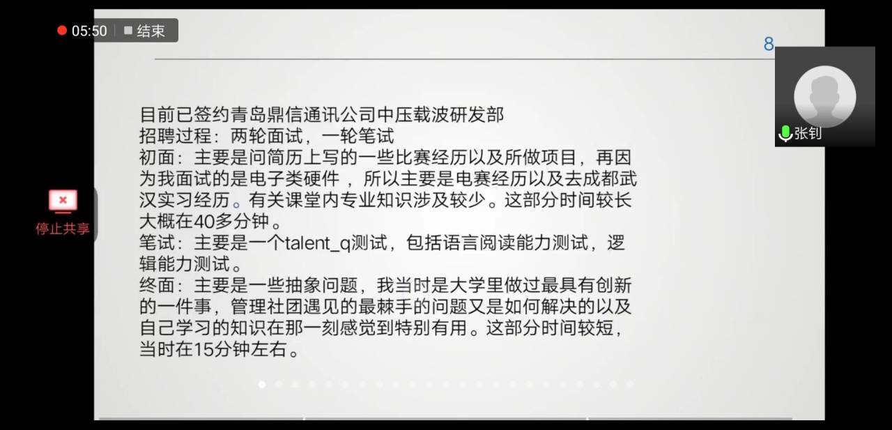 首先,寇帅同学分享了自己对就业和考研的独到见解以及求职简历的制作技巧。接着,张文焯同学讲了自己如何海投、笔试、面试等求职的完整过程,推荐了一些实用的网站和学习书籍。之后,张钊同学根据自身经历鼓励大家要致知于行,为将来的就业积累实习经验。最后,张智宇同学分享了自己充实的大学生活,鼓励大家不要忘初心,有计划有目标地度过每一天。云讲座期间穿插观众提问环节,同学们积极提出自己的疑问,嘉宾一一进行解答。
