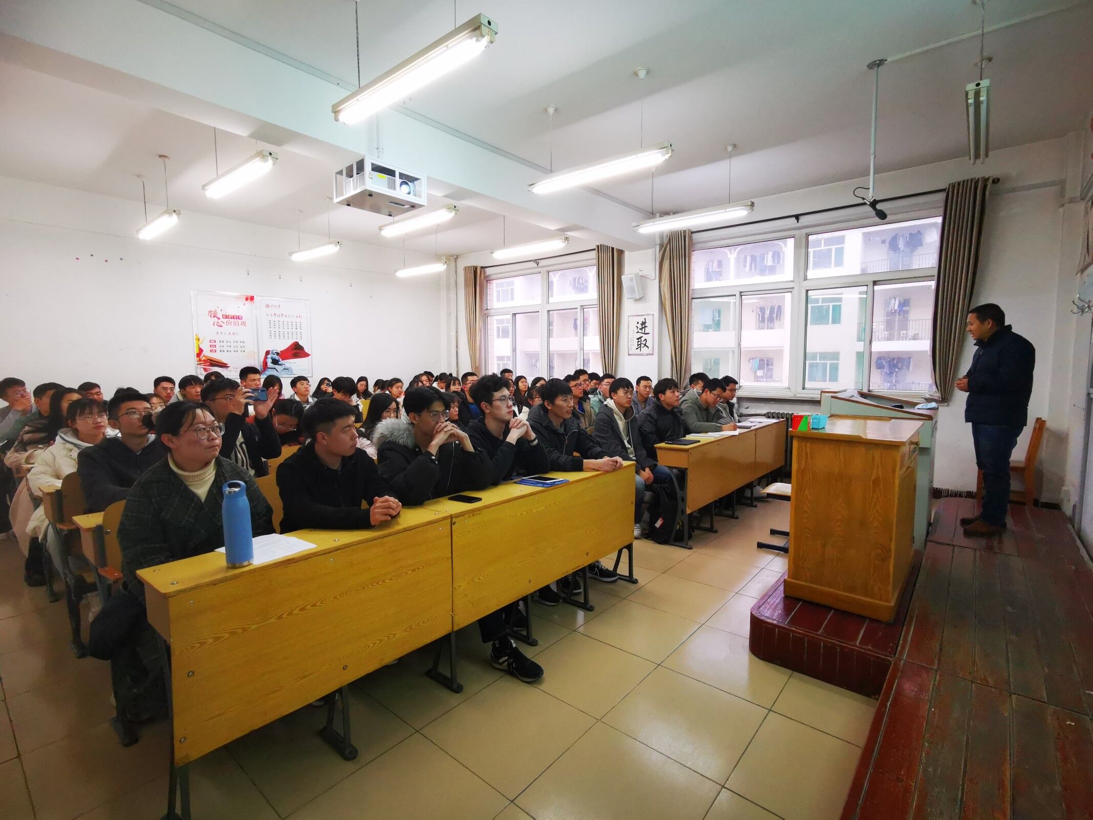 宣讲中,张权老师首先讲述了有习近平同志作为党中央的核心,全党的核心领航掌舵,有全党全国各族人民团结一心,顽强奋斗,我们就一定能够战胜前进道路上出现的各种艰难险阻,一定能够在新时代把中国特色社会主义更加有力地推向前进的重要论断。随后张权老师紧紧围绕《中共中央关于制定国民经济和社会发展第十四个五年规划和二O三五年远景目标的建议》展开讲解。系统介绍了2035年基本实现社会主义现代化远景目标和“十四五”时期我国发展的指导思想、主要目标、重点任务。最后张权老师希望同学们不仅要深刻领会会议精神,更重要的是将理论融入到实际生活中,把理论和实践相结合,将工作和学习完成的更加优秀。牢记历史使命,勇做有理想、有品德、有本领、有担当的时代新人。