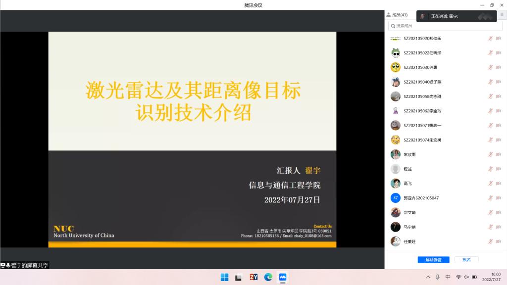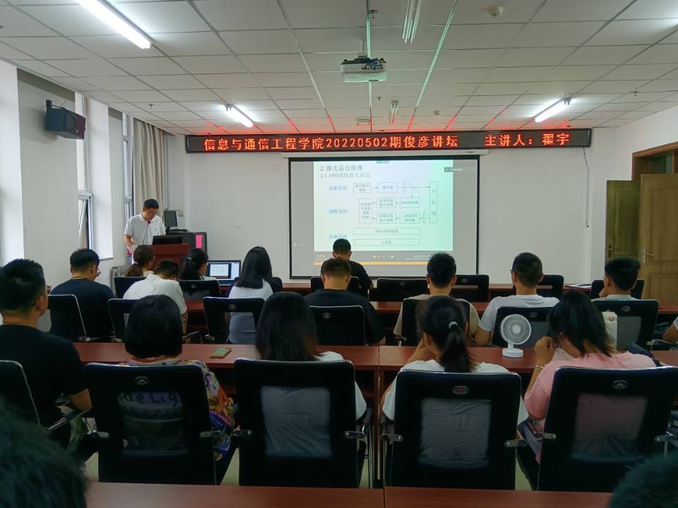 7月27日上午10点,第20220502期俊彦讲坛在科学楼B座715学术报告厅成功举行。我院新入职青年教师翟宇以“激光成像雷达及其距离像目标识别技术”为题与全体研一学生展开了相关探讨。