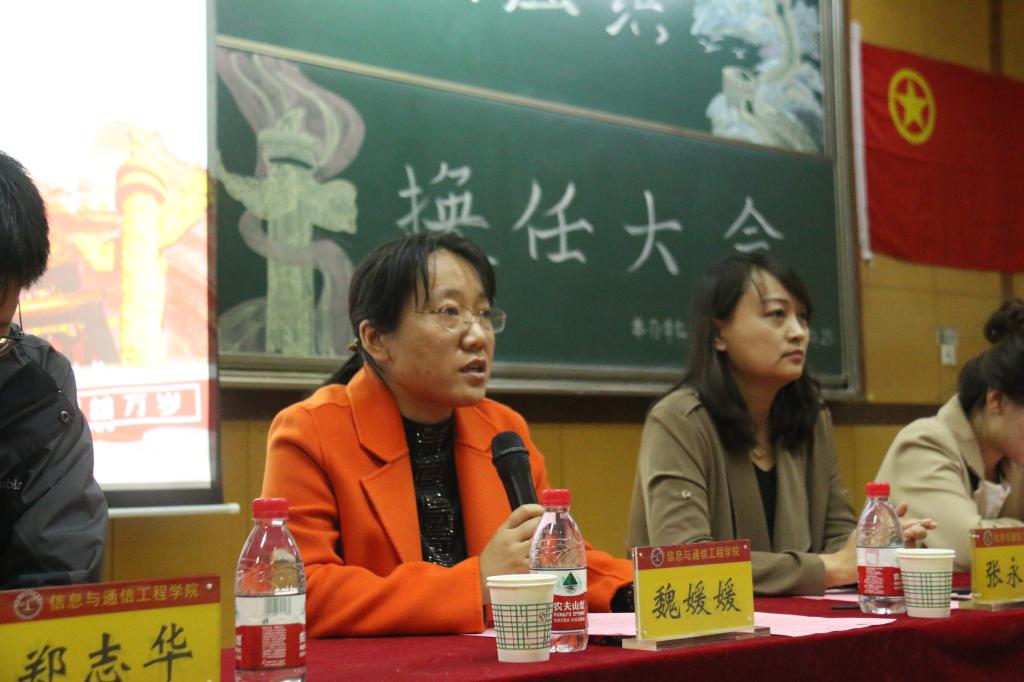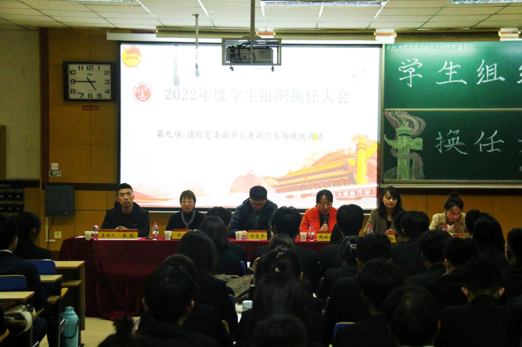 10月25日下午,信息与通信工程学院2022年度学生组织换任大会在09202H教室成功举办。学院党委副书记兼副院长魏媛媛、科研科科长郑志华、团委书记闫婷、学生科张永玲、王秋惠老师及本科生、研究生全体学生骨干出席大会。会议由院团委王彪老师主持。