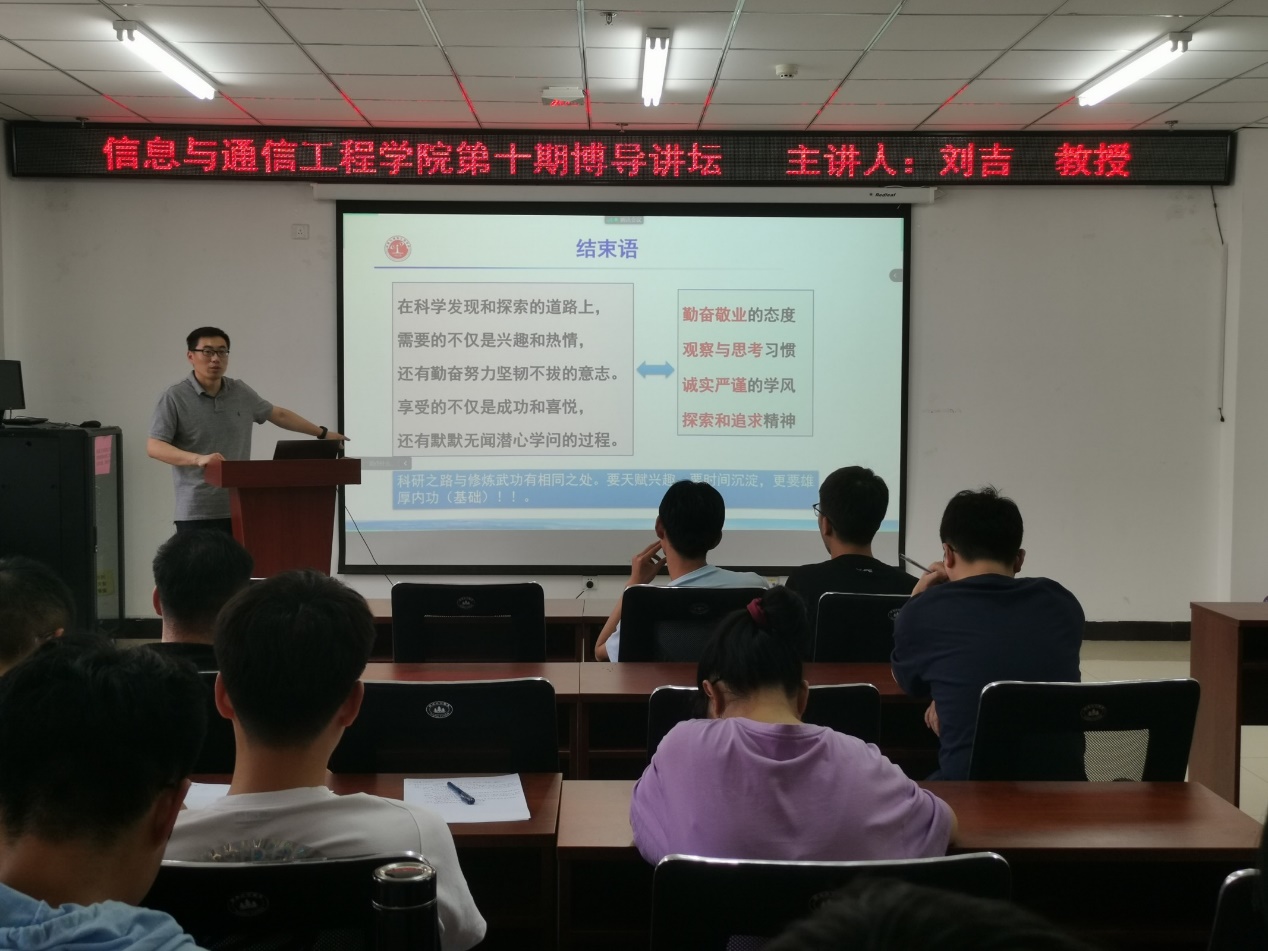 6月17日上午,信息与通信工程学院在科学楼B座715学术报告厅成功举办第十期博导讲坛,讲座采用线上线下相结合的方式。我院博士生导师刘吉教授为研一学生开展了题为“研究生如何开展科研实践”的讲座,全体研一同学聆听了讲座。