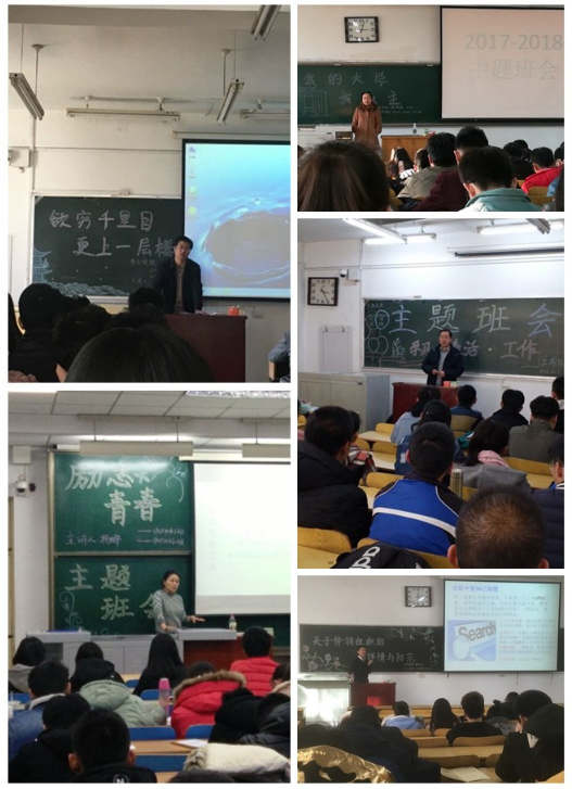 老师们针对学生需求认真选题,师生共同商定班会主题,达到良性互动,效果显著。大一同学以适应性教育、专业认知、安全教育、如何度过大学四年为主题;大二同学以人际关系、创新实践、社会热点等问题为主题;大三、大四同学以考研就业、创业择业等为主题。
