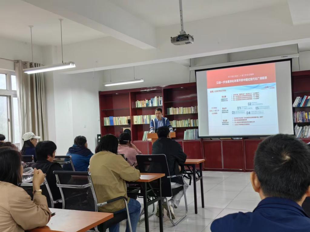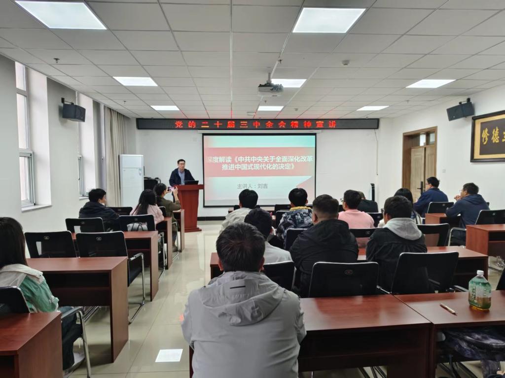 学院党委书记曹凤才对接研究生第二、第三党支部。曹书记授课时指出,党的二十届三中全会精神的核心在于“全面深化改革”和“推进中国式现代化”,这既是对过去改革经验的科学总结,也是对未来改革发展的总体部署,要深刻认识到,只有全面深化改革,才能不断破解发展难题,增强发展动力,厚植发展优势;只有推进中国式现代化,才能确保我国始终沿着社会主义道路前进,实现中华民族伟大复兴的中国梦。