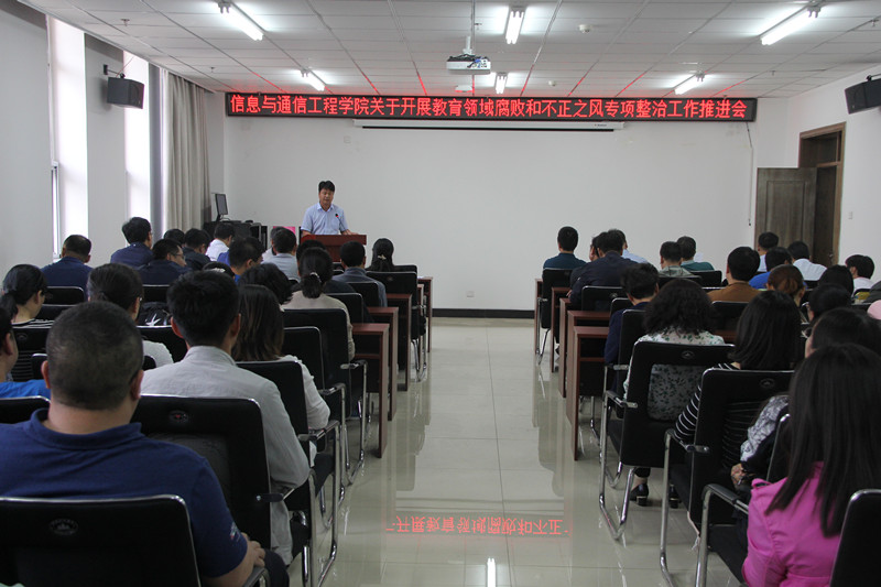 首先,院党委书记曹凤才宣读了《信息与通信工程学院关于开展教育领域腐败和不正之风专项整治的实施方案》,他要求全体教师务必认清形势,提高政治站位,高度重视此次专项整治工作的重大意义,把专项整治工作落实落细。曹书记从四个方面提出具体要求:一是认真落实责任,层层传导压力,把三种责任扛在肩上;二是突出整治重点,聚焦资金管理使用、关键领域和关键环节、惠民政策落实、干部队伍作风等四个方面的突出问题,下大力气解决师生员工反映强烈的实际问题;三是开展考风考纪专项整治,大力推进学风建设;四是加强师德师风排查,告诫大家7条红线绝不能碰。要认真贯彻全国高校思想政治工作会议精神,下大气进一步加强师德师风建设。全体教师要坚持立德树人、教书育人、言传身教,努力做学生健康成长的指导者和引路人。希望通过大家共同努力,形成更加良好的教风、学风和院风,更好地促进教学科研工作。