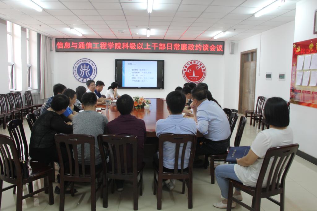 为了扎实推进全面从严治党向纵深发展,实践好监督执纪的“四种形态”,切实提高党员干部风险防控意识,根据党纪[2018]1号文件《关于集中开展全校科级以上干部日常廉政约谈的通知》安排,2018年5月14日下午,信息与通信工程学院党委在科学楼713会议室进行了科级以上干部廉政约谈工作。全体院领导、党委委员、学科管理部主任和副主任、各科室负责人参加了本次会议。