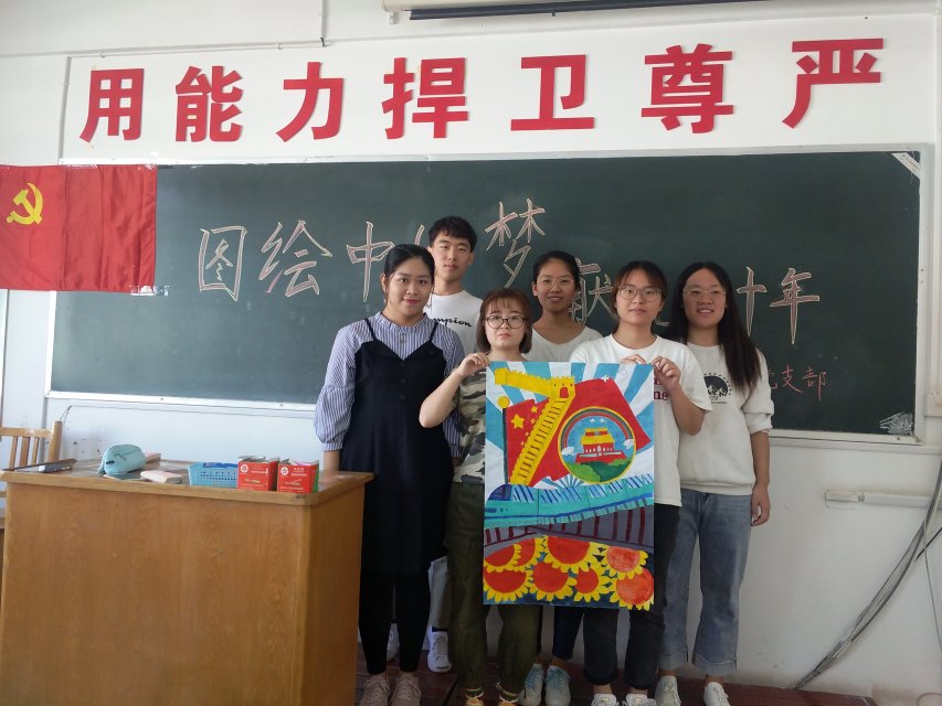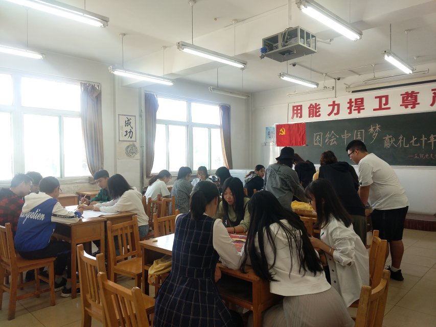 为了隆重庆祝新中国成立70周年,激发学生爱党爱国的热情,提升大学生党员的党性修养和文化素养,我院学生党支部特举办“图绘中国梦,献礼七十年”绘画活动。本次活动举办时间为2019年9月28日上午9点,地点在10409教室,由我院党支部成员合力举办,每个专业党支部各出一幅作品作为祖国70周年生日贺礼。