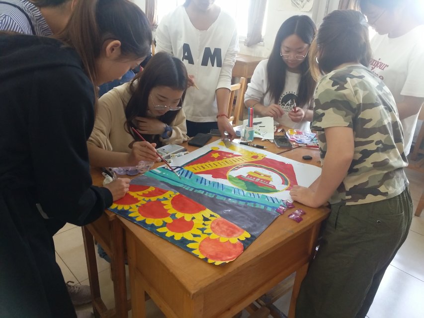 本次活动主要分为三个部分:1.各支部协商并确定好绘画主题;2.各支部合力现场作画;3.各支部展示作品并讲解作品的意义。整个绘画过程井然有序,大家齐心协力,各显身手,一双双灵巧的手下流淌着对祖国的热爱之情。