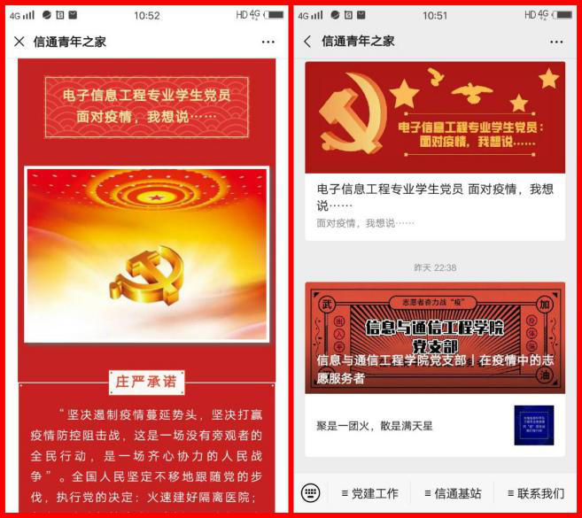 各支部将活动进展情况以图文形式推送到了学院公众号“信通青年之家”,营造了正面舆论氛围:尽管疫情还在,只要我们坚定信念,每个党员带头发挥不畏困难,无私奉献的精神,就一定能打赢这场阻击战。