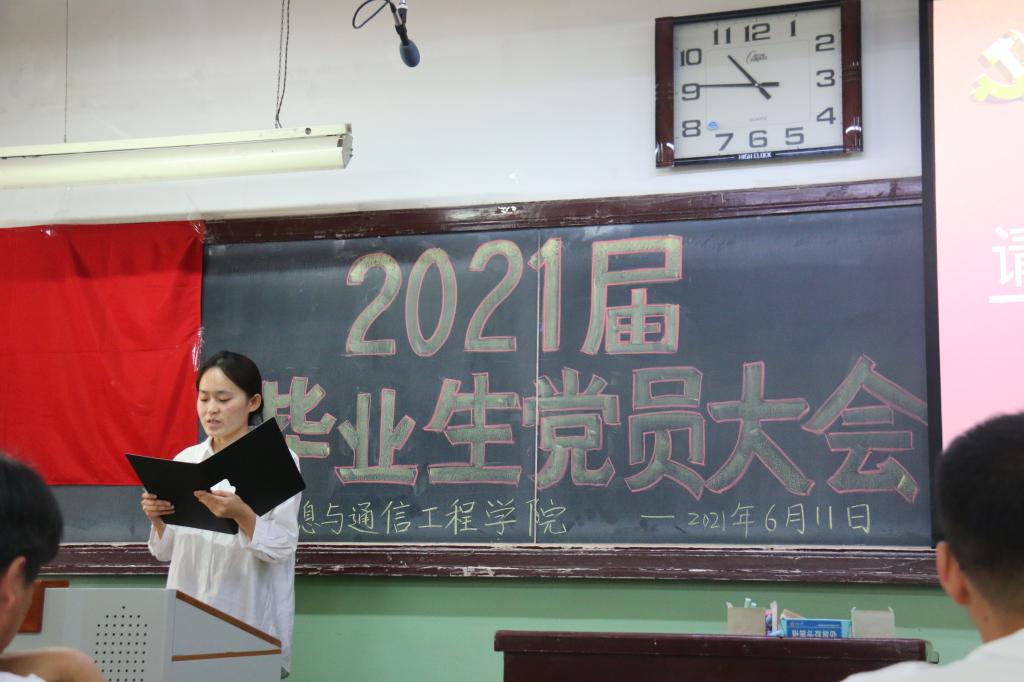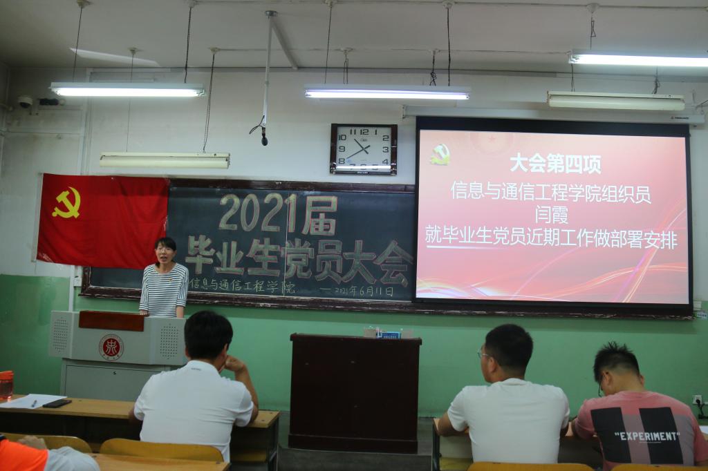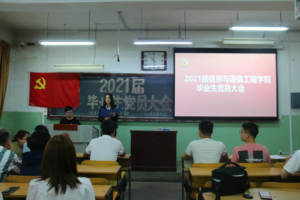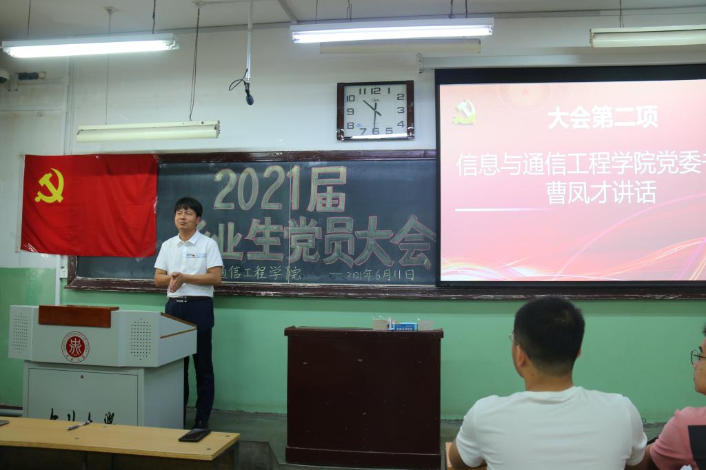 2021年6月11日上午,在01101教室,信息与通信工程学院党委组织召开了2021届毕业生党员大会,院党委书记曹凤才、院党委副书记兼副院长魏媛媛、各学生党支部书记、全体2021届毕业生党员参加了大会。