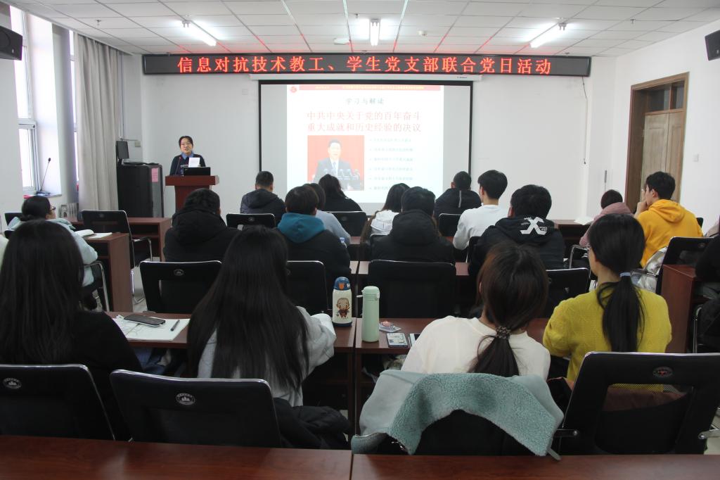党委委员、党委副书记魏媛媛对接信息对抗技术专业师生党支部。她号召大家要深入学习宣传和贯彻落实好党的十九届六中全会精神,深刻领会十九届六中全会的重大意义,准确把握十九届六中全会的精神实质,全面做好十九届六中全会的实践要求,以高度的责任感和历史使命感推动全会精神落到实处。