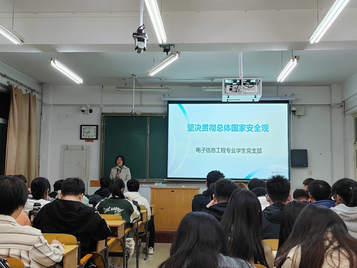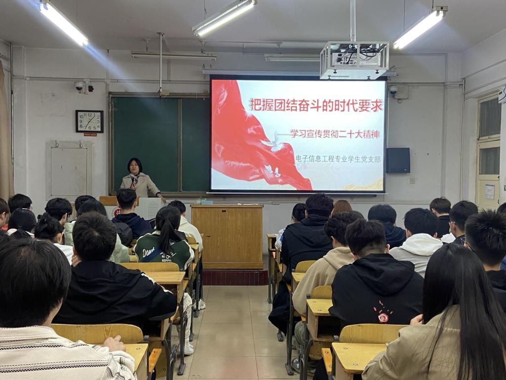 为深入学习贯彻党的二十大精神,感悟思想真谛、筑牢思想之基,2023年4月13日在10305教室,电子信息工程专业学生党支部书记陈淑霞以“把握团结奋斗的时代要求——学习宣传贯彻二十大精神”为题讲授专题党课,全体党员参加了学习。
