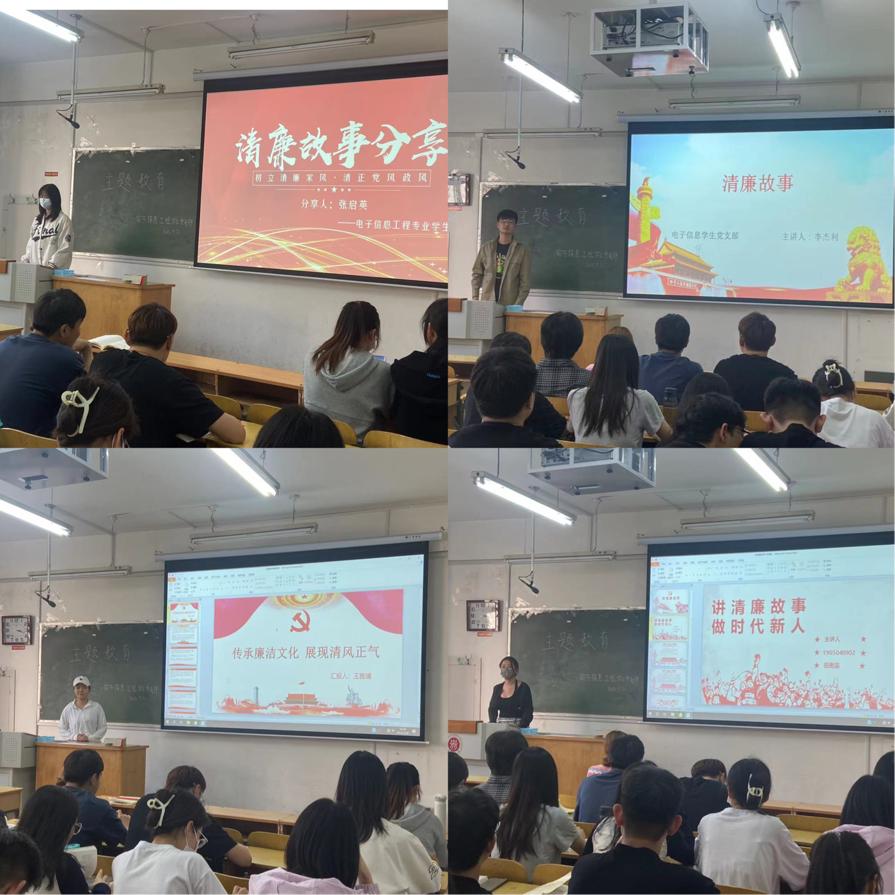 为深入学习贯彻习近平新时代中国特色社会主义思想主题教育,推进清廉校园文化建设,2023年6日6日在10301教室,电子信息工程专业学生党支部开展“传承廉洁文化,共建清廉校园”主题党日活动,引导党员端正思想观念,提升精神境界,严守纪律底线,弘扬清廉作风。