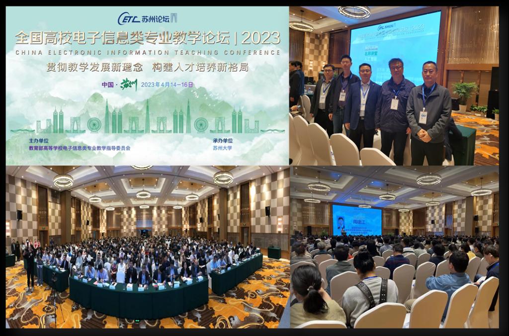 2023年4月14-16日,第六届全国高校电子信息类专业教学论坛在苏州召开,本次论坛主题为“贯彻教学发展新理念,构建人才培养新格局”, 论坛是由教育部高等学校电子信息类专业教学指导委员会主办,苏州大学承办。电子信息教指委王志军副主任、邓成秘书长、周建江委员及光电教指分委张亚萍委员应邀出席,来自全国300余所高校的600余位电子信息相关专业院校领导、专业负责人及骨干教师共同分享交流电子信息类专业建设与改革实践经验。我校信息与通信工程学院院长陈平、光电工程系主任程耀瑜、电子与通信工程系主任陈友兴、副主任李凯、王晨光、骨干教师苏新彦一行参加了此次论坛。