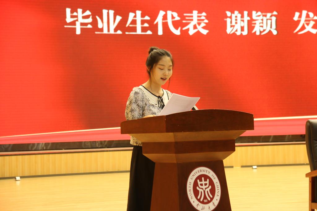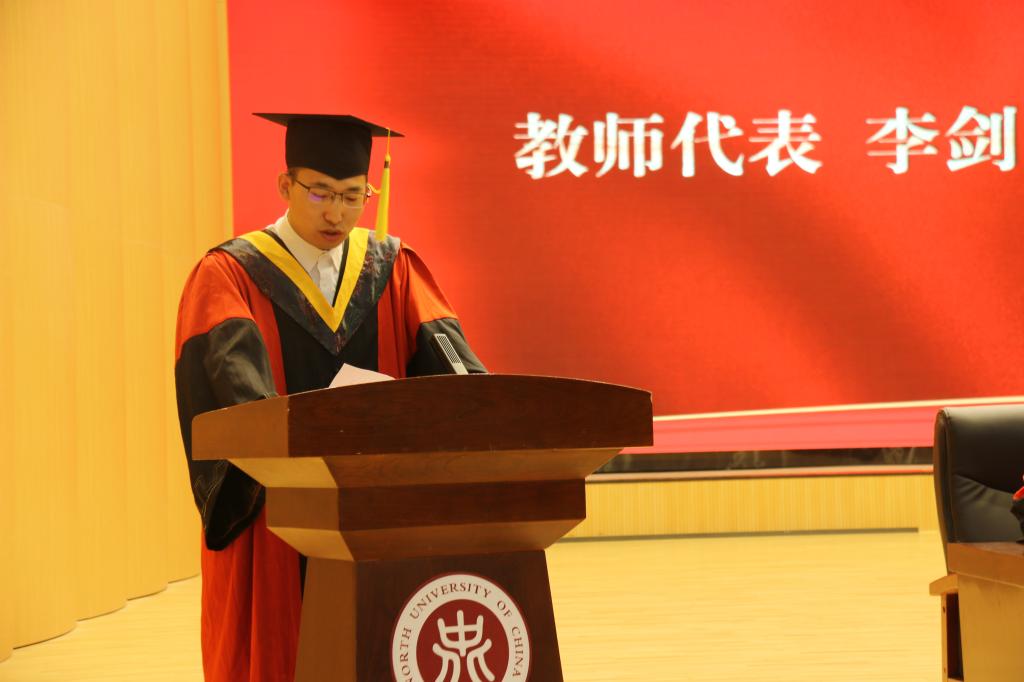接着,毕业生代表谢颖发言,回顾校园生活与学习经历,道出毕业生共同的心声,日后将继续践行“致知于行”的校训,不负母校的殷切期望。在校生代表李恒发言,祝愿学长、学姐们在日后事业中鹏程万里,前程似锦。教师代表李剑希望同学们肩负使命,承担责任,用匠心打磨青春,以奉献诠释担当,在更广阔的舞台上续写中北荣光。