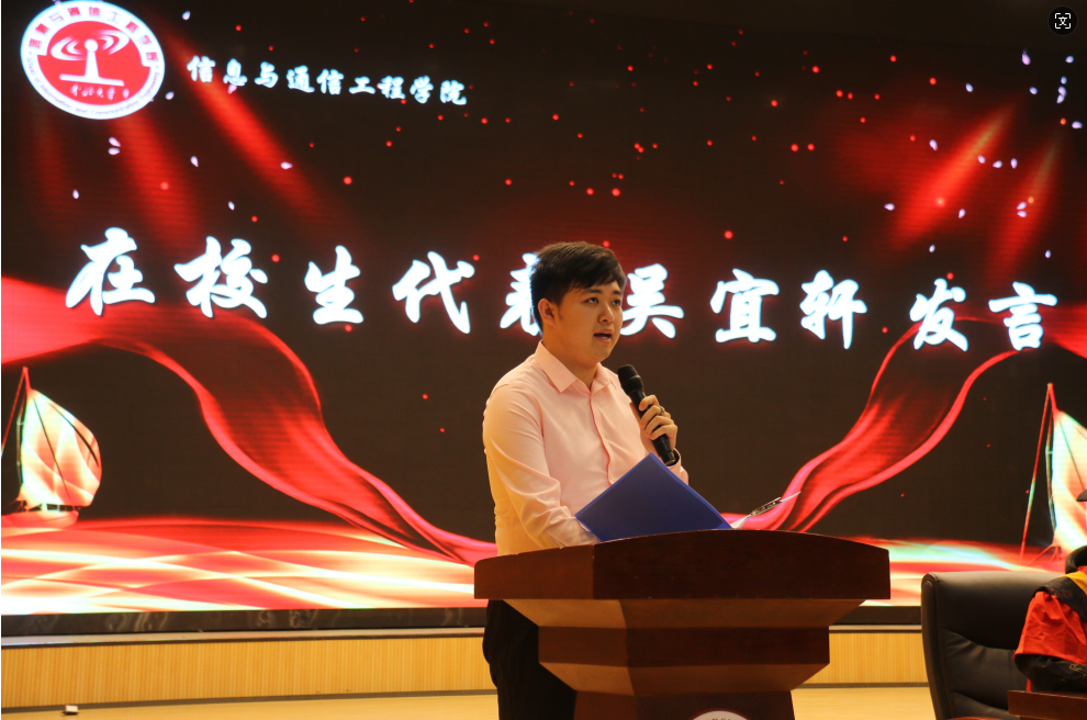 接着,毕业生代表张佳炘同学发言,她回忆了自己与信通的青春故事,感恩母校,恩师,表达了接续奋斗、回报母校、回报祖国的决心。在校生代表吴宜轩同学发言,祝愿学长、学姐们在日后事业中鹏程万里,前程似锦。教师代表孙鹏希望同学们使命在肩,做矢志报国的奋斗者;自强不息,做致知于行的践行者。
