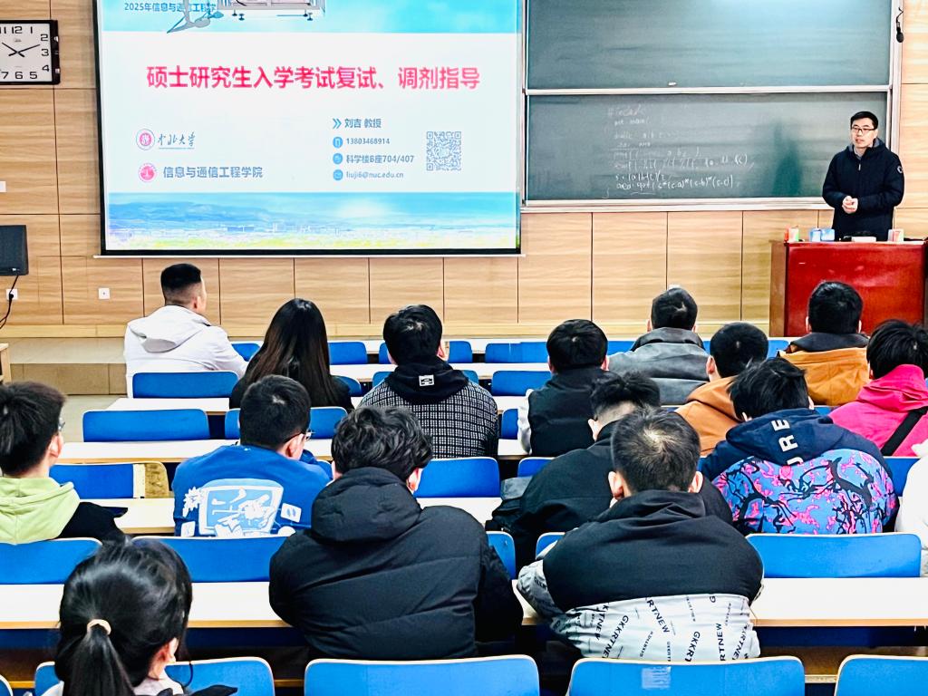 聚焦科学备考,助力成功“上岸”。3月6日上午,中北大学信息与通信工程学院在09202H教室举办2025年考研复试与调剂指导讲座。学院科研副院长刘吉担任主讲人,为备战研究生复试与调剂的学子们提供了全面细致的备考建议。学院毕业班班主任陈淑霞、王彪、孟伟和备战复试与调剂的考生一起参加了活动。