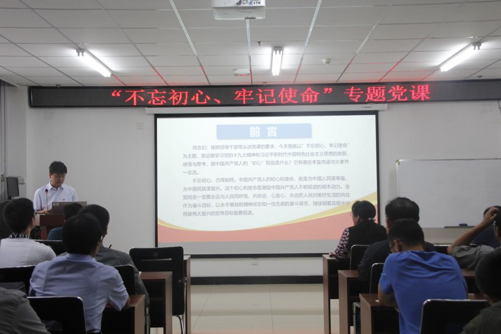 随后,曹书记就自己学习党的十九大精神和习近平新时代中国特色社会主义思想的收获、感悟与思考,与全体党员同志们做了分享。曹书记首先从中国共产党的“初心”是什么开讲:“初心”就是不忘历史、敢于担当、不忘人民;其次是共产党人为什么要“不忘初心”?因为“初心”是党的行动纲领、奋斗目标、是党前进的动力,是党的优良作风;以及共产党人如何做到“不忘初心”?曹书记倡导大家要坚定信念跟党走、直面使命敢当担、挺纪在前不逾矩、无私奉献有作为、立足岗位做贡献。最后,曹书记用“坚持提高党性修养、补思想之钙、固党性之元、铸党性之魂”,“平时能看出来、关键时刻能站出来,危机关头能豁出来”与大家共勉!