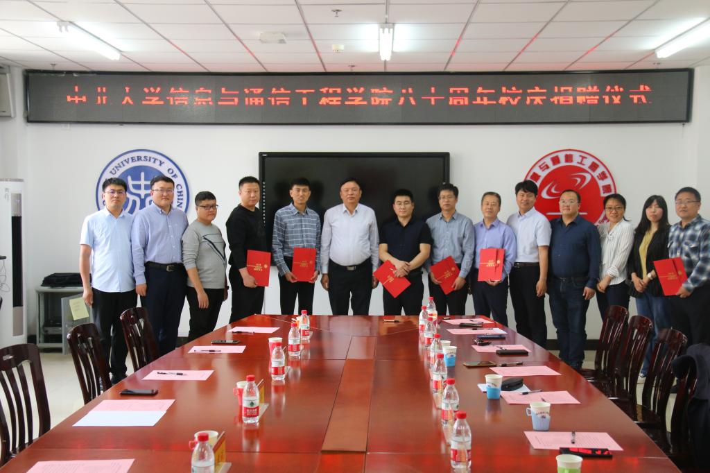 饮水思源,学成念师。5月14日上午,信息与通信工程学院80周年校庆捐赠仪式在院楼713会议室隆重举行。山西灏峰源科技有限公司总经理郭文峰、北京方正世纪信息系统公司总经理李军、玉田县广顺商贸有限公司总经理静海涛,校友柴俊、张建峰、光建斌,中北大学副校长赵贵哲、工程训练中心主任赵正杰、中北大学教务处副处长高春强、学院全体院领导出席捐赠仪式。会议由党委副书记兼副院长魏媛媛主持。