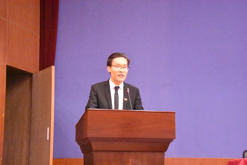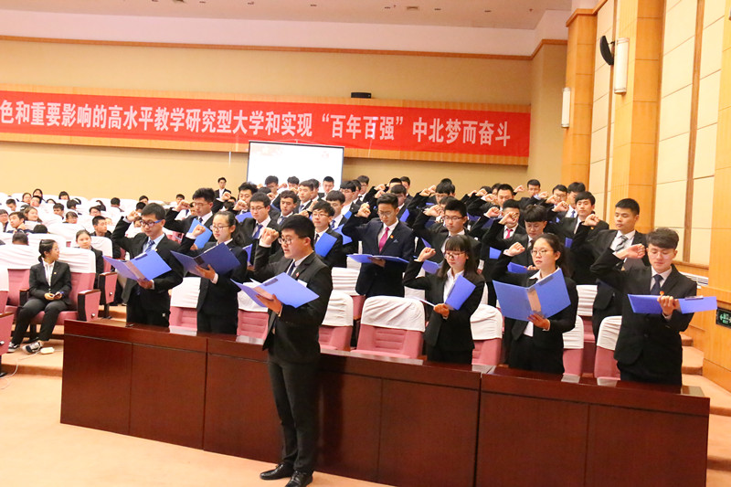 伴随着激昂的国歌声,大会拉开了帷幕。首先,院党委副书记魏媛媛对学院2017年学风建设整体工作进行了全面的总结,并对期末成绩、早操、早读、查课及处分情况做了通报。接着,院党委书记曹凤才对2018年学风建设工作做了整体部署与安排,他希望同学们在优良的院风、班风和学风中成长成才。随后,科研副院长王明泉宣读了对2017年国家奖学金、中北奖章、校长奖章、优良学风班的表彰决定,号召大家向榜样学习,争当榜样。中北奖章获得班级14050Z01班、校长奖章获得者14050243班朱洪杨以及优良学风班获得班级14050341班作了风采展示,他们分别从班级建设、个人成长等方面逐一分享,引起台下同学的共鸣。
