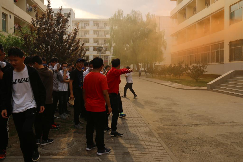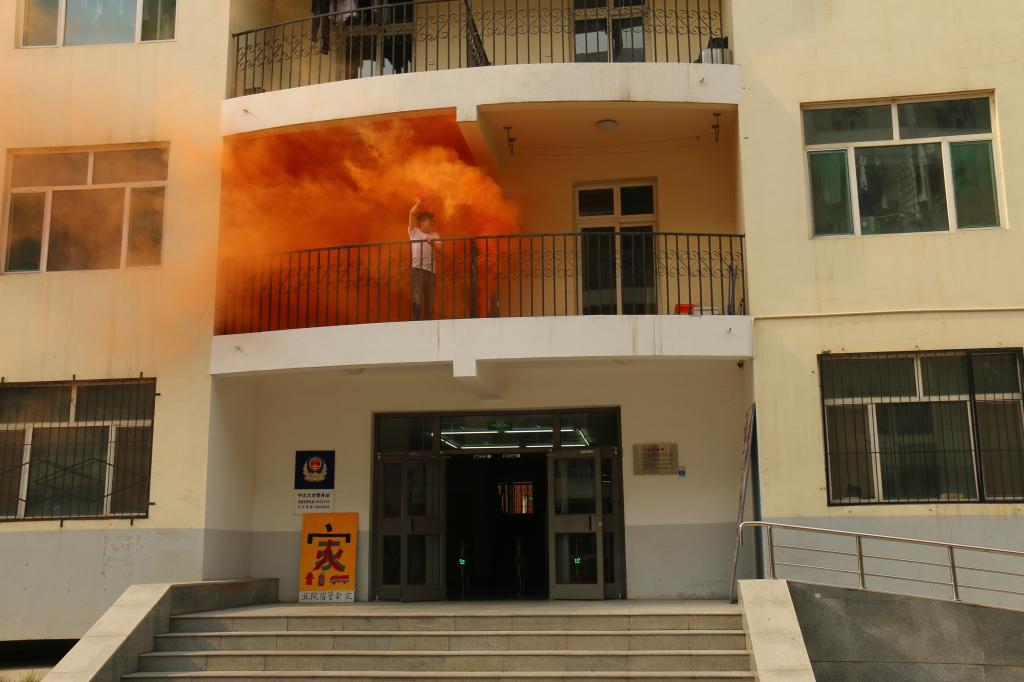 首先以烟雾弹模仿火情发生。文韬四楼管阿姨第一个发现215宿舍的火情,立马向上级汇报,请求指示。接到疑似火情的报告后,学院领导成立紧急工作小组。副总指挥任雁老师指挥现场,宣布启动消防应急预案,分配各个组的任务并向总指挥魏媛媛教授汇报情况;各组长到指挥部前集合接受了命令并向成员下达。