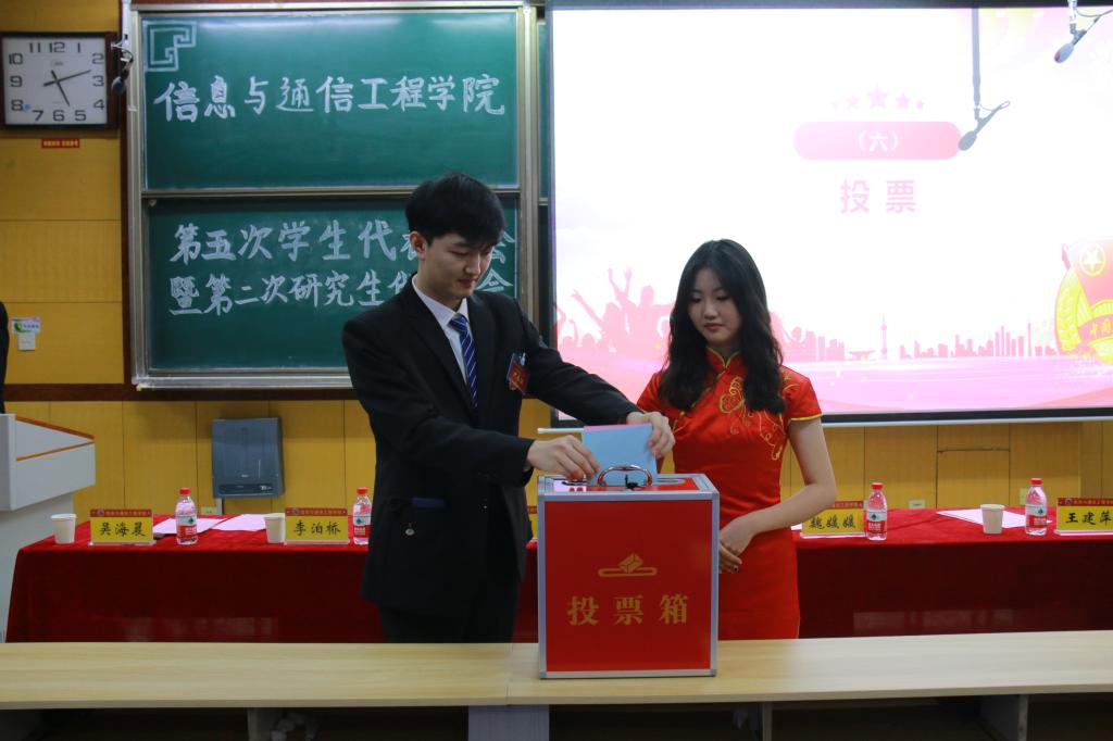 大会表决通过了总监票人、监票人,总计票人、计票人名单及《信息与通信工程学院第五次学生代表大会暨第二次研究生代表大会选举办法》,并投票选举产生了新一届学生会主席团、研究生会主席团成员和中北大学第四次学生代表大会代表、第二次研究生代表大会代表。院团委书记闫婷宣读了选举结果。