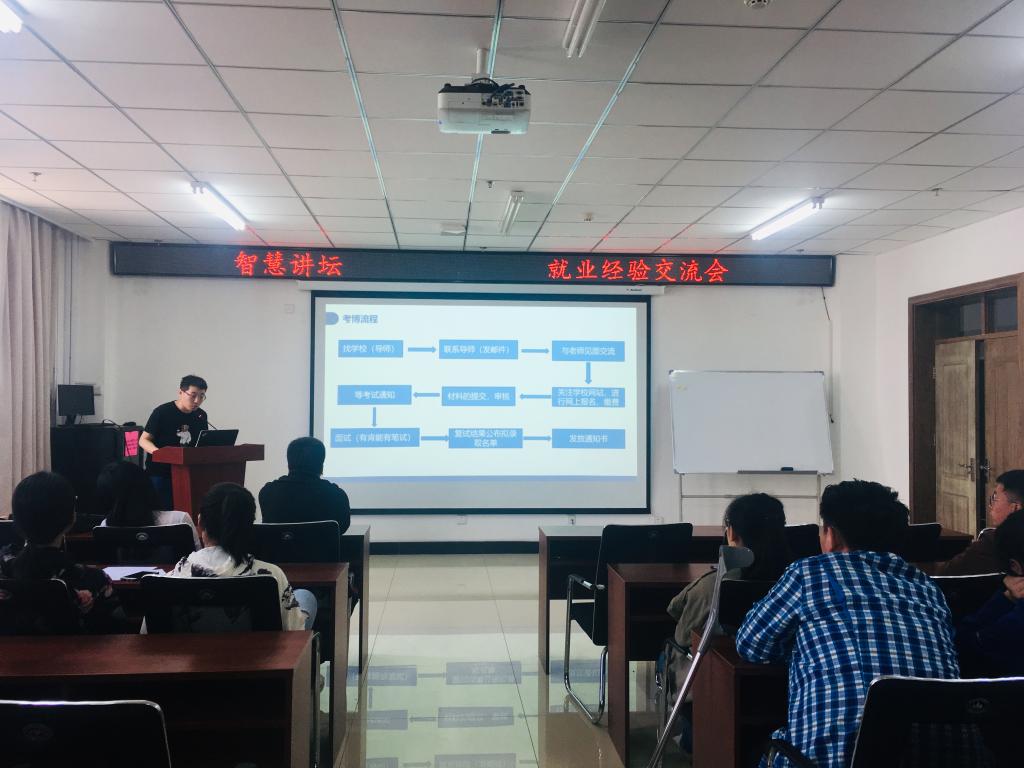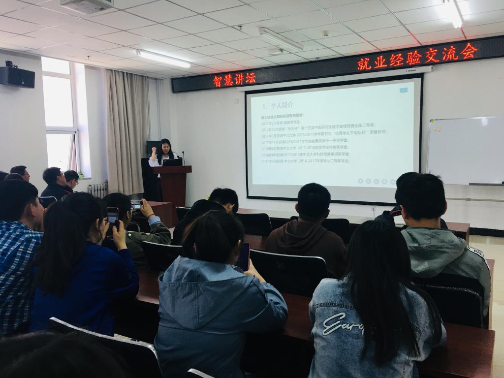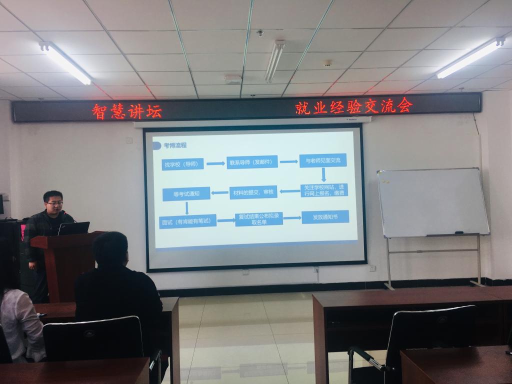 交流会交流会开始,首先由朱博秀同学将自己在研究生期间需要提高培养的知识储备做了一个详细的介绍,讲述了自己求职的必备技能和心路历程。接着刘旭明同学就自己的求职经历详细地为大家剖析了求职过程中需要注意的各种问题,认清自己,找准定位,做好充足的准备,明确定位后就朝着目标不懈努力。张鹏同学分享了自己考博的经历,从如何找学校找导师到如何与导师见面交流,再到材料的提交与审核以及笔试面试中需要注意的问题都做了详细的介绍。刘一鸣同学就自己申请攻读博士学位简历应该如何撰写,如何投递等做了介绍。最后,王建萍老师鼓励大家面对当今就业压力,要迎头赶上,做好充分的准备,把握住可能的实习机会,为今后的就业打下坚实的基础。