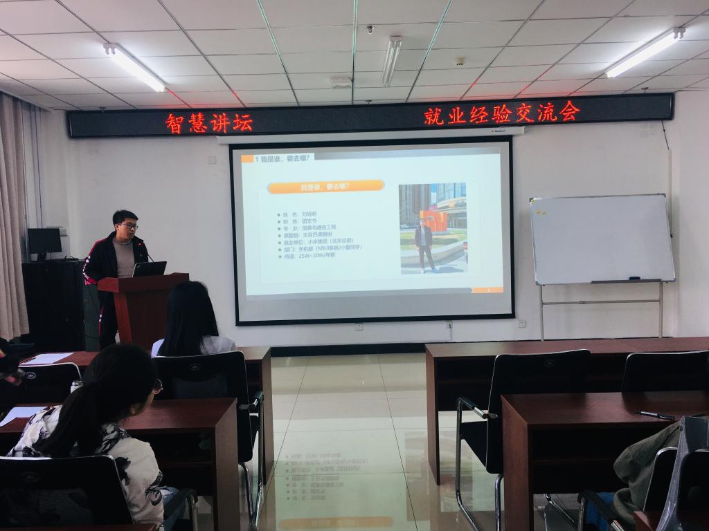 2019年5月9日上午10点,信息与通信工程学院17级全体研究生在院楼715学术报告厅参加“智慧讲坛”暨2019届毕业生就业经验交流会。本次交流会的主讲人为即将入职工作以及读博深造的四位优秀毕业学子,他们介绍了关于自身定位、职业规划、行业选择、职位选择、简历制作、笔试面试等方面的经验,为即将面临求职或继续读博深造的17级研究生提供了宝贵的经验,对于以后的职业生涯规划提供了极具价值的信息分享。