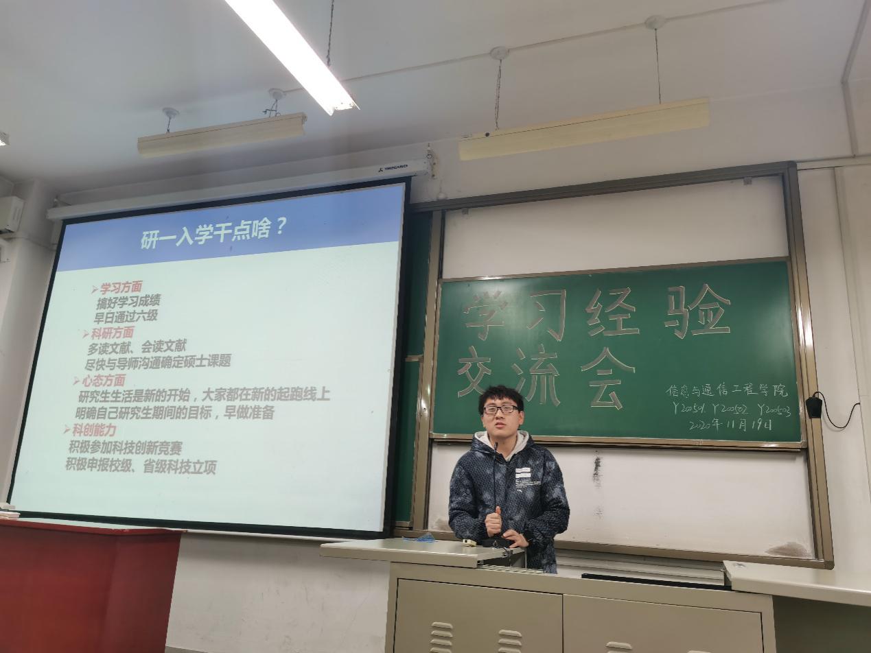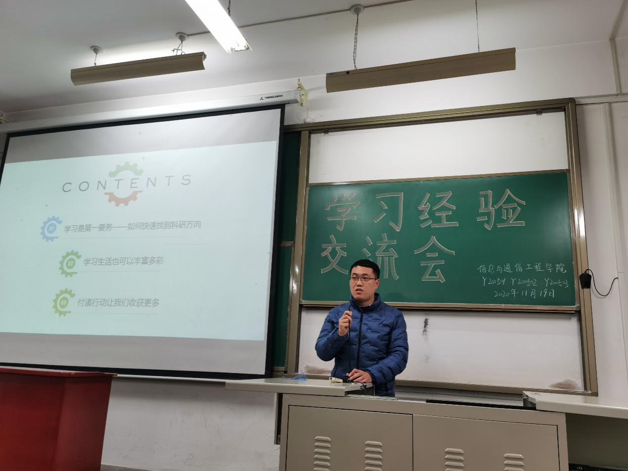 2020年11月19日晚7点,信息与通信工程学院在13201H教室召开了研究生学习经验交流会。本次交流会邀请了2017级博士生燕慧超同学和2018级硕士生冯士杰同学担任主讲,学院2020级全体研究生新生到现场聆听。