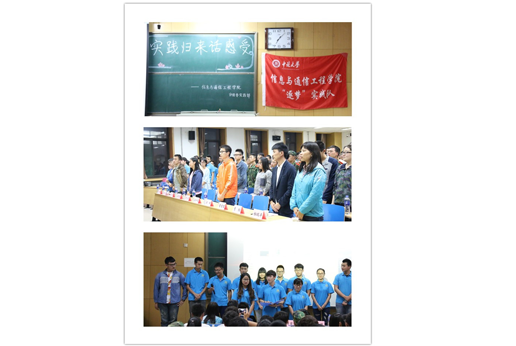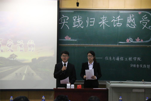 伴着庄严的团歌本次活动正式开始。首先,由李欣老师上台讲话,简洁中肯地总结了这次暑期社会实践,同时希望参加这次暑期社会实践的同学们能继续努力,总结经验,不断创新,明确自己的使命,激发自己的热情,调整和完善自己的知识结构,战胜各种困难和挫折,锻炼自己的意志和毅力,为以后的工作做好充分的准备。接着,由杜老师宣布个人和集体实践的汇报名单。紧接着社会实践学生代表从不同角度、不同层面向大家讲述了自己的亲身经历,向同学们传授了宝贵的经验。最后,“逐梦”实践队的负责人郭志浩给大家讲述了他们团队的暑期社会实践活动,回顾实践活动的点点滴滴,更多同学了解到社会实践的真正的目的和意义,纸上得来终觉浅,绝知此事要躬行。他们朴实真挚的话语向所有学生展示了大学生的强烈社会责任感和使命感。随着“逐梦”歌曲的演唱本次座谈会圆满结束。
