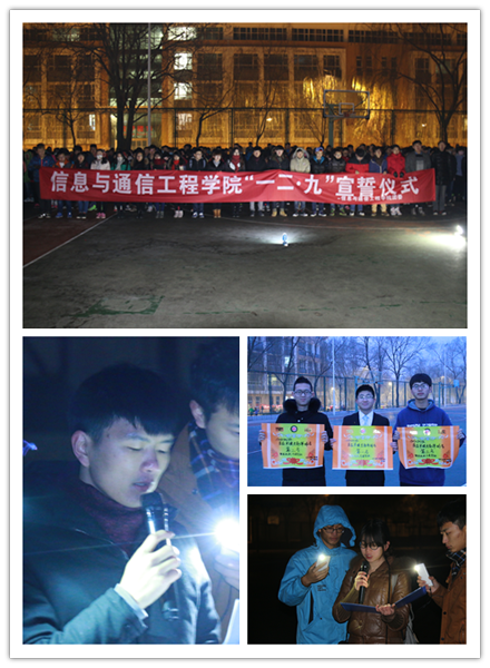为了进一步让信息与通信工程学院同学了解历史,增强同学们的忧患意识。我院于2015年12月9日早6:30在东区篮球场举办了“12.9”宣誓仪式,以此来纪念八十年前的12.9学生运动。出席仪式的嘉宾有信息与通信工程学院团委副书记李欣老师及学生会主席团成员。