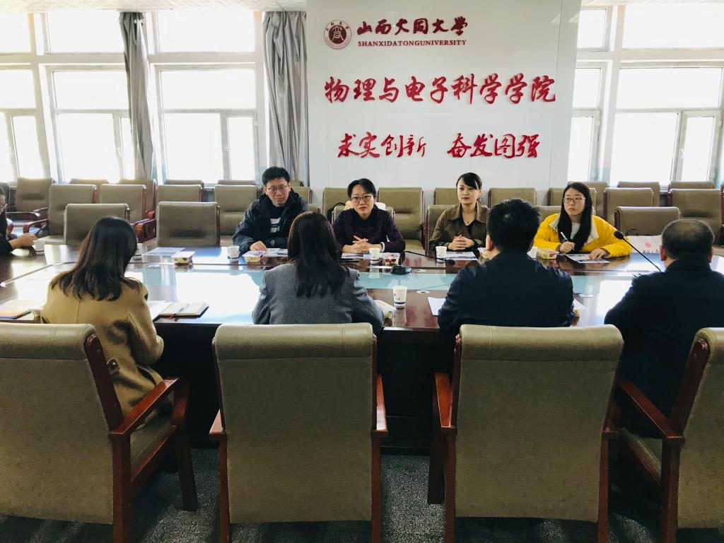 2021年10月22日下午,学院党委副书记兼副院长魏媛媛等一行5人赴山西大同大学物理与电子科学学院就学院各项工作开展情况进行了交流。山西大同大学物理与电子科学学院党委书记罗青、党委副书记解廷月、副院长苏新武等出席座谈并对学院一行的到来表示热烈欢迎。
