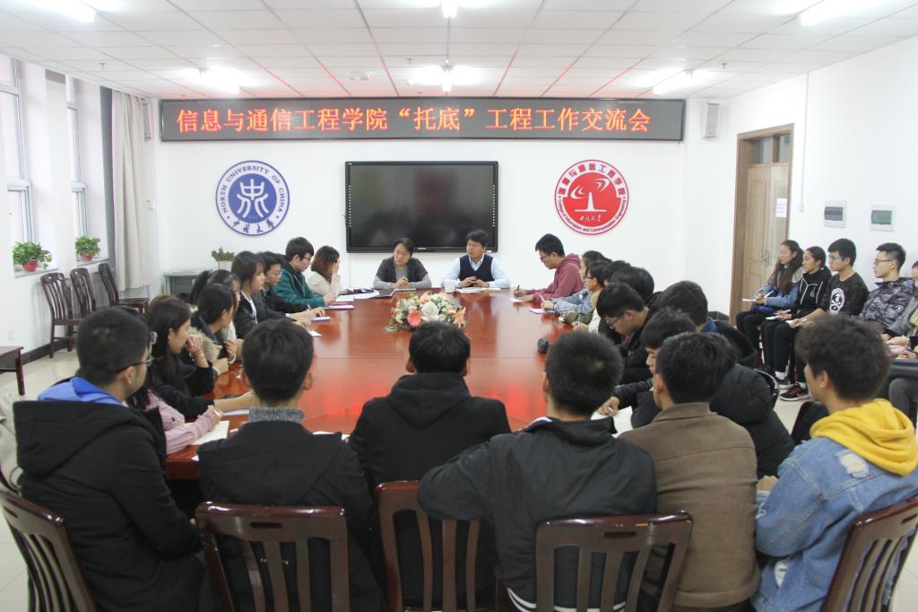 2018年11月21下午16:00,信息与通信工程学院在科学楼713召开了“托底”工程工作交流会。院党委书记曹凤才老师、院党委副书记魏媛媛老师、学生科陈淑霞老师以及各个年级的团支书代表参加了本次会议。