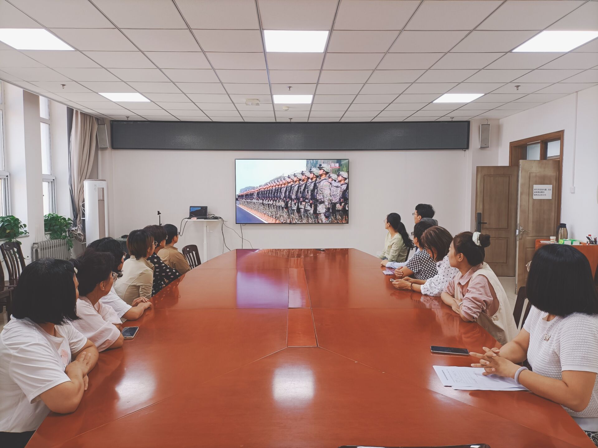 活动当天,学院精心安排了宽敞的会议室作为观看场地,提前调试好设备,确保画面清晰、声音流畅。党员们怀着激动与崇敬的心情早早来到会议室,有序就座。随着阅兵仪式正式开始,庄严的国歌奏响,全体党员自觉起立,全神贯注地盯着屏幕,被那整齐划一的方队、先进的武器装备以及受阅官兵们坚毅的神情所深深震撼,不时爆发出热烈的掌声,表达着对祖国的热爱和对人民军队的赞美。