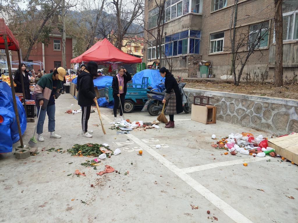 在党支部书记石老师的指导下,同学们又将垃圾进行分类处理,菜市场和水果市场的摊主们纷纷竖起了大拇指,并对大家自觉清扫、维护环境的行为表示了感谢。