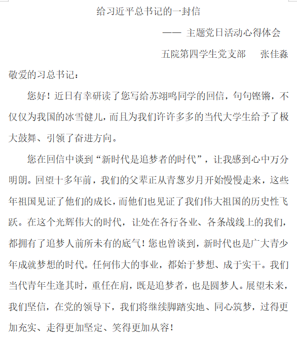 活动开始,我支部全体成员共同学习了有关习总书记给中国冰雪健儿重要回信精神,并在之后展开了讨论,领会了习总书记对广大青少年提出的期望和要求。更有同学表示“我一定会心系祖国、脚踏实地、久久为功、报效祖国,牢记教诲,勇攀高峰,日后努力在世界舞台上为祖国增光添彩”。之后,我们通过“给习近平总书记的一封信”的形式,将每位同学自身感受与心得融入信中。