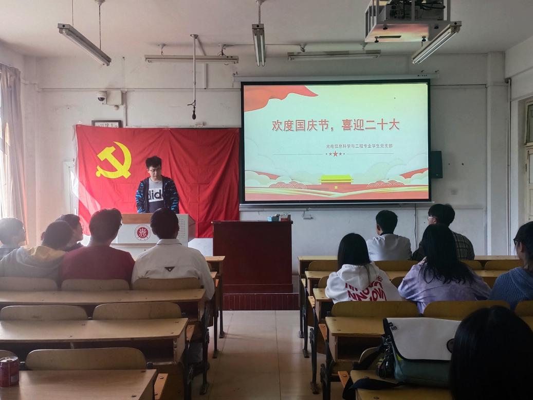 为庆祝新中国成立73周年,迎接党的二十大胜利召开,光电信息科学与工程专业学生党支部于9月25日在10307H开展以“欢度国庆节,喜迎二十大”为主题的党日活动。