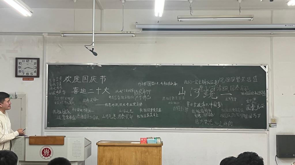 在党日活动的最后,每一位支部成员在黑板上写下了对祖国生日的祝福;一点一滴的祝福在黑板上汇聚成为对祖国祝福的海洋,正如我们青年的点滴青春奋斗,汇聚成为祖国事业的伟大洪流。