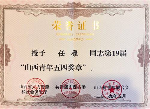 祝贺我专业教师任雁喜获第十九届“山西青年五四奖章”
