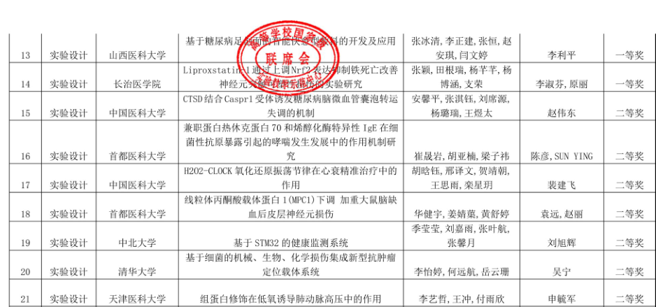 第八届全国大学生基础医学创新论坛暨实验设计论坛大赛于四月初拉开帷幕,我院生物医学工程系积极组织本科学生参加了本科院校基础临床组,其它、综合与交叉学科(生物医学工程/再生医学、医工交叉等)亚组的比赛。参加本次大赛校级选拔赛的队伍共有10组,55名学生。经过专家的认真评审,评选出校级一等奖2名,二等奖4名,三等奖4名并推荐4支队伍晋级区域赛。