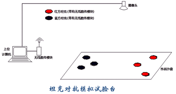 最后,通过无线数传模块将各种执行指令传送到同样携带有无线数传模块的双方坦克小车上,进行陆战对抗模拟。